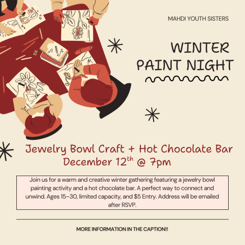 The Mahdi Youth Sisters are excited to invite sisters ages 15–30 to our Sisters Paint Night on Friday, December 12th at 7:00pm! We’ll be making cute jewelry bowl crafts, sipping from our cozy hot chocolate bar, and enjoying a relaxed, fun evening together.