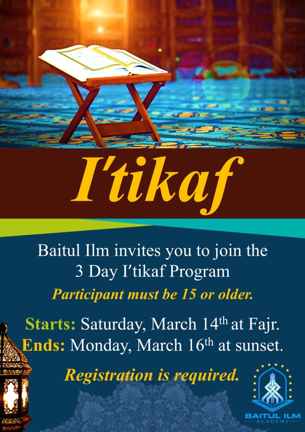 Baitul Ilm will be hosting a three-day i'tikaf program. During i'tikaf, the worshiper devotes his or her time to worship and does not leave the masjid premises. This year's i'tikaf will start at Fajr on March 14 until sunset on March 16. All participants must be 15 years of age or older.