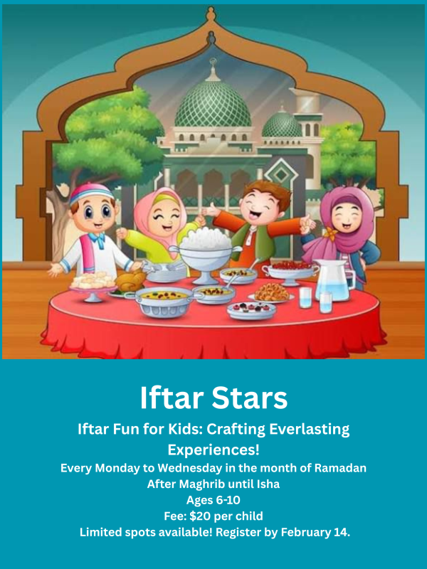 We are excited to bring back this program to inspire young kids, ages 6-10, to experience fasting and recognize the significance of one of Islam's pillars. Registered participants will fast for a few hours or complete their fasts. The program will run on Mondays, Tuesdays, and Wednesdays starting from the 1st of Ramadan. A group of volunteers will be there to support the children as they break their fast in the downstairs library. Kids will have Storytime, games and Trivia. As part of the program, the children will be encouraged to track their fasting progress, read the Quran at home, and engage in other acts of kindness.