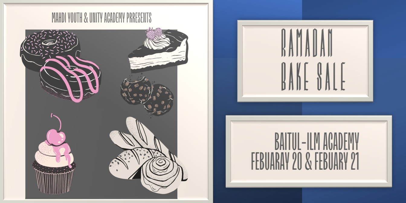 Mahdi Youth & Unity Academy are excited to host a Ramadan Bake Sale at Baitul-Ilm Academy on Thursday, February 20 and Friday, February 21. Sisters and community members are invited to support this fundraiser by contributing baked goods or stopping by to purchase treats.
