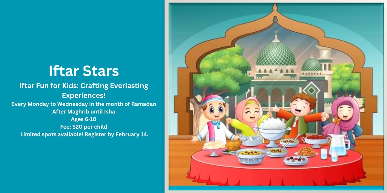 We are excited to bring back this program to inspire young kids, ages 6-10, to experience fasting and recognize the significance of one of Islam's pillars. Registered participants will fast for a few hours or complete their fasts. The program will run on Mondays, Tuesdays, and Wednesdays starting from the 1st of Ramadan. A group of volunteers will be there to support the children as they break their fast in the downstairs library. Kids will have Storytime, games and Trivia. As part of the program, the children will be encouraged to track their fasting progress, read the Quran at home, and engage in other acts of kindness.