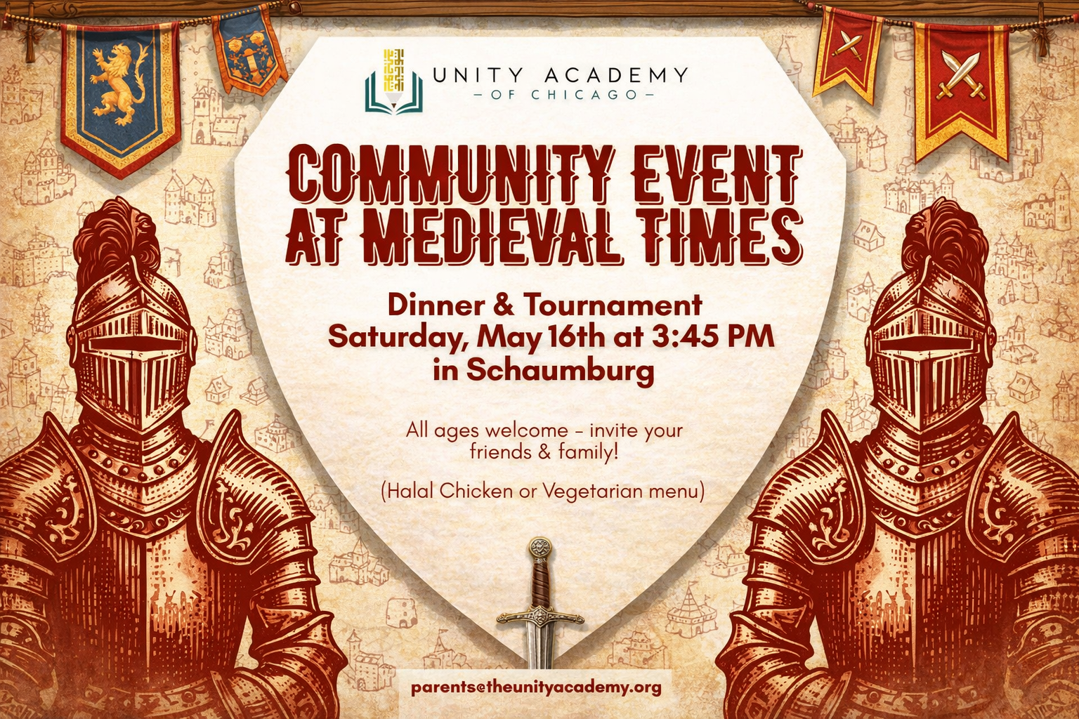 Unity Academy is excited to offer a discounted group rate for an outing to Medieval Times in Schaumburg on Saturday, May 16th at 3:45 PM. The experience includes the full tournament with live jousting, plus a halal dinner option for all attendees.