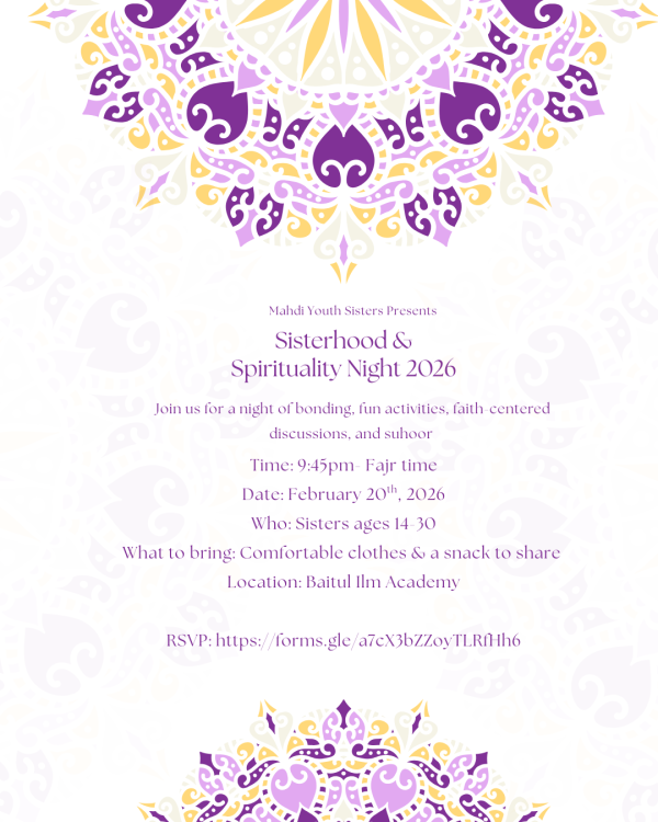 Mahdi Youth Sisters are excited to host our Sisterhood & Spirituality Night 2026, an overnight sisters-only gathering at the mosque focused on connection, reflection, and faith. This event will include bonding activities, faith-centered discussions, and suhoor as we spend the night together in a safe and welcoming environment.
