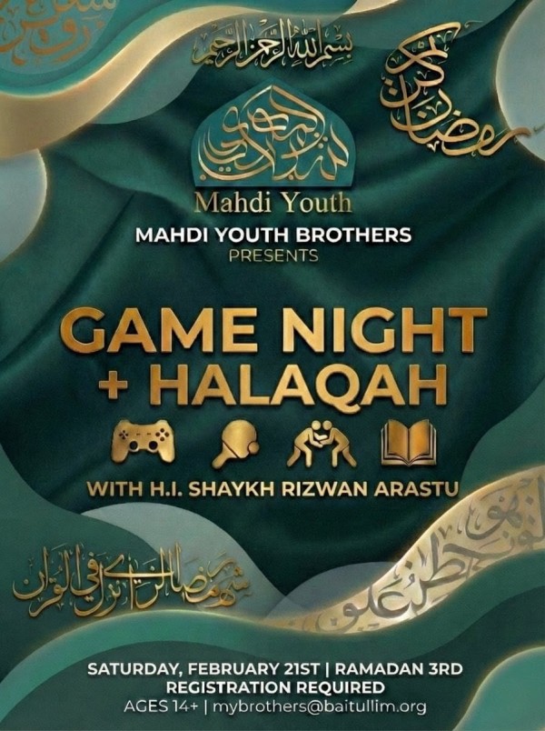 Join us on Friday, Feb 21st (Ramadan 3rd) at Baitul-ilm, after the lecture, for an evening of brotherhood featuring a Halaqah with H.I. Shaykh Rizwan Arastu followed by food, ping pong, spikeball, video games and much more!