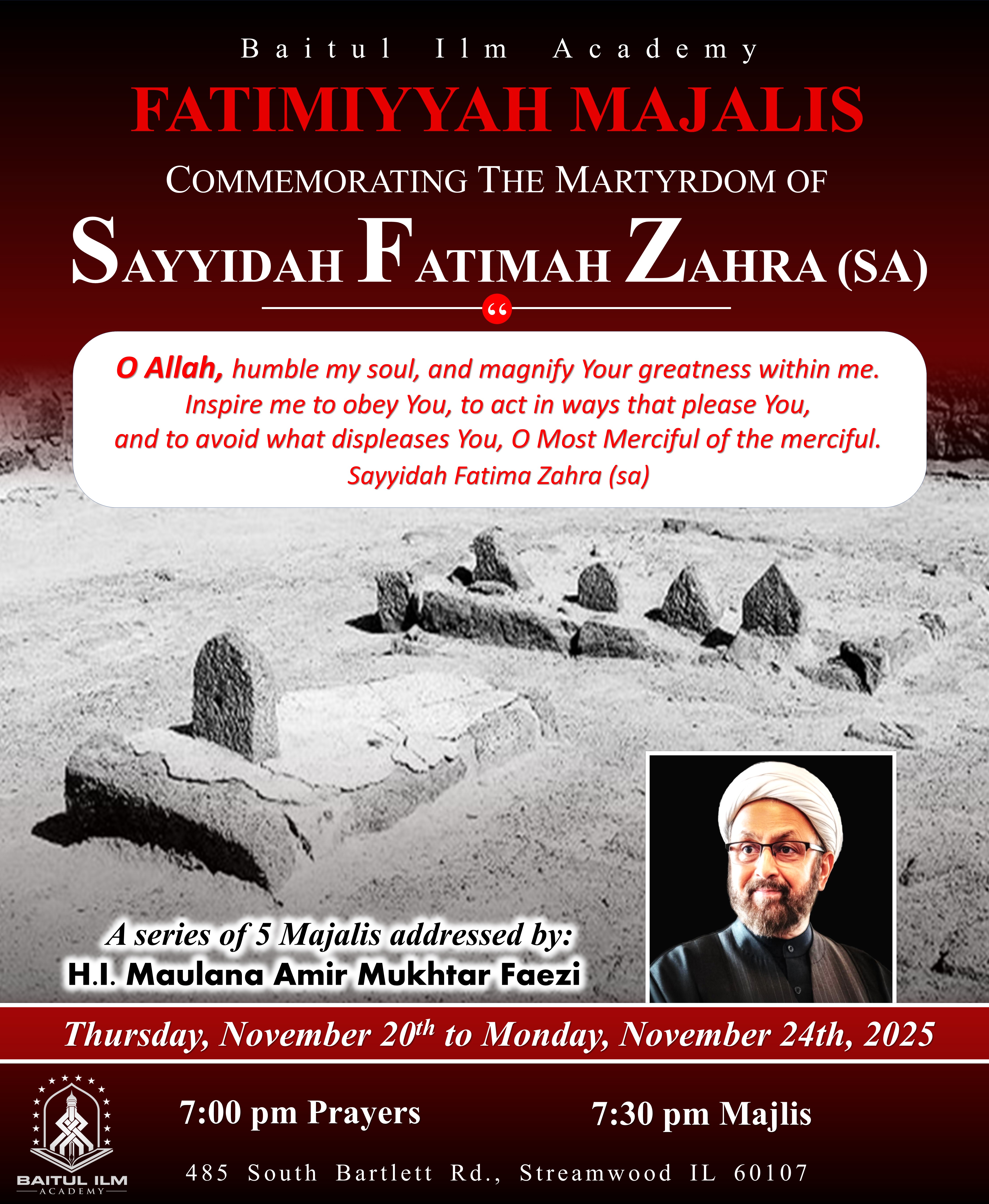 Majalis Schedule: 7:00pm - Maghrib & Isha Prayer 7:30pm - Majlis addressed by H.I. Maulana Amir Mukhtar Faezi Followed by matam and ziyarat