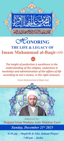 Program Details: 6:30pm - Maghrib & Isha Jamaat Prayer 7:00pm - Jashn addressed by H.I. Maulana Amir Mukhtar Faezi Followed by dinner in the Banquet Hall.
