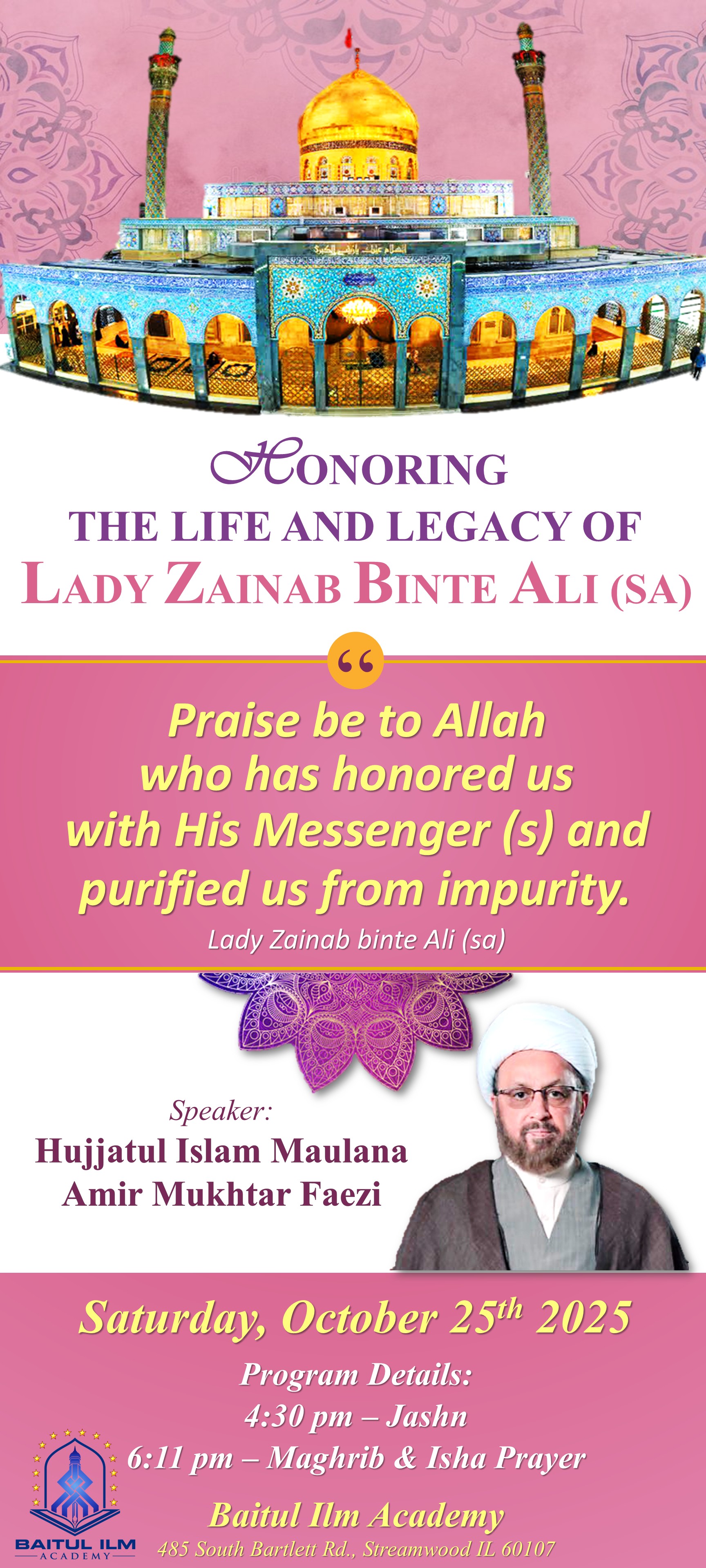 4:30pm - Jashn addressed by Hujjatul Islam Maulana Amir Mukhtar Faezi 6:11pm - Maghrib & Isha Prayers