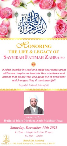 Program Details: 4:37pm - Maghrib & Isha Prayer 5:15pm - Jashn addressed by H.I. Maulana Amir Mukhtar Faezi Followed by dinner in the Banquet Hall.