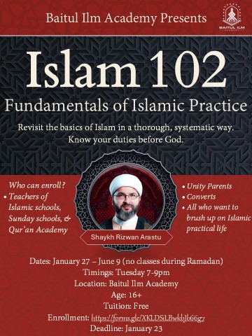Baitulilm is pleased to offer Islam 102: Fundamentals of Islamic Practice, a course designed and taught by Shaykh Rizwan Arastu to revisit the basics of Islam. This course is an excellent opportunity for our community educators, youth and members at large to systematically go through the foundational principles of our faith in a structured manner with a highly qualified scholar.