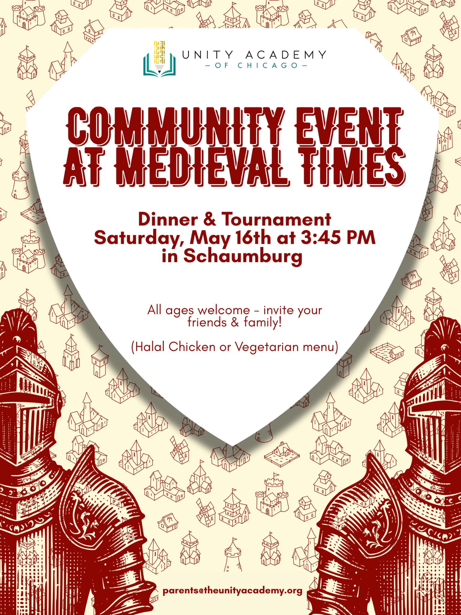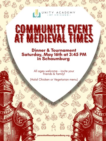 Unity Academy is excited to offer a discounted group rate for an outing to Medieval Times in Schaumburg on Saturday, May 16th at 3:45 PM. The experience includes the full tournament with live jousting, plus a halal dinner option for all attendees.
